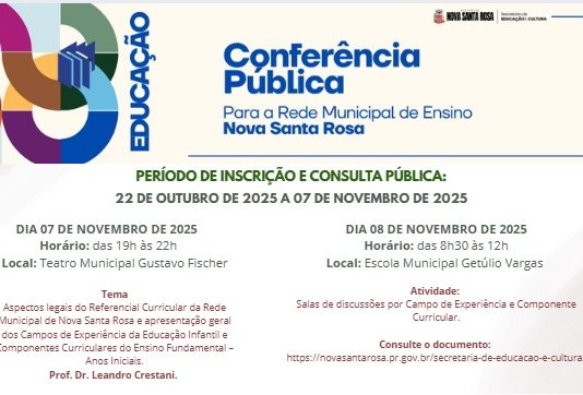 A Prefeitura de Nova Santa Rosa, por meio da Secretaria de Educação e Cultura, convida toda a comunidade para prestigiar a Semana...