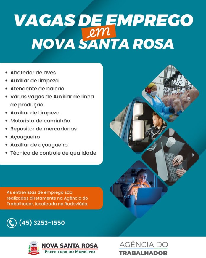A Agência do Trabalhador de Nova Santa Rosa está com diversas vagas de emprego abertas para diferentes áreas de atuação. As oportunidades contemplam candidatos com variados perfis profissionais, ampliando as possibilidades de inserção no mercado de trabalho no município.