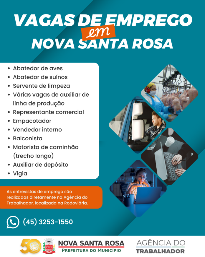 A Agência do Trabalhador de Nova Santa Rosa está com diversas oportunidades de emprego abertas para diferentes áreas. As vagas contemplam funções operacionais, comerciais e de serviços, ampliando as chances de inserção no mercado de trabalho para a população.