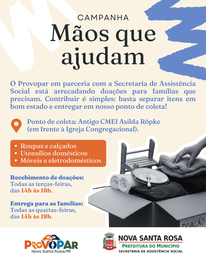 O Provopar (Programa do Voluntariado Paranaense) de Nova Santa Rosa, em parceria com a Secretaria de Assistência Social, lançou a campanha “Mãos que Ajudam”, com o objetivo de arrecadar roupas, utensílios domésticos, móveis e eletrodomésticos em boas condições de uso para repasse às famílias que mais necessitam no município.