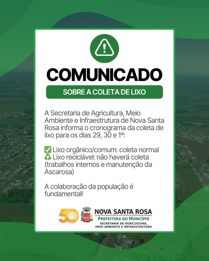 A Secretaria de Agricultura, Meio Ambiente e Infraestrutura de Nova Santa Rosa divulgou o cronograma da coleta de lixo para os dias 29 e 30 de abril e 1º de maio.