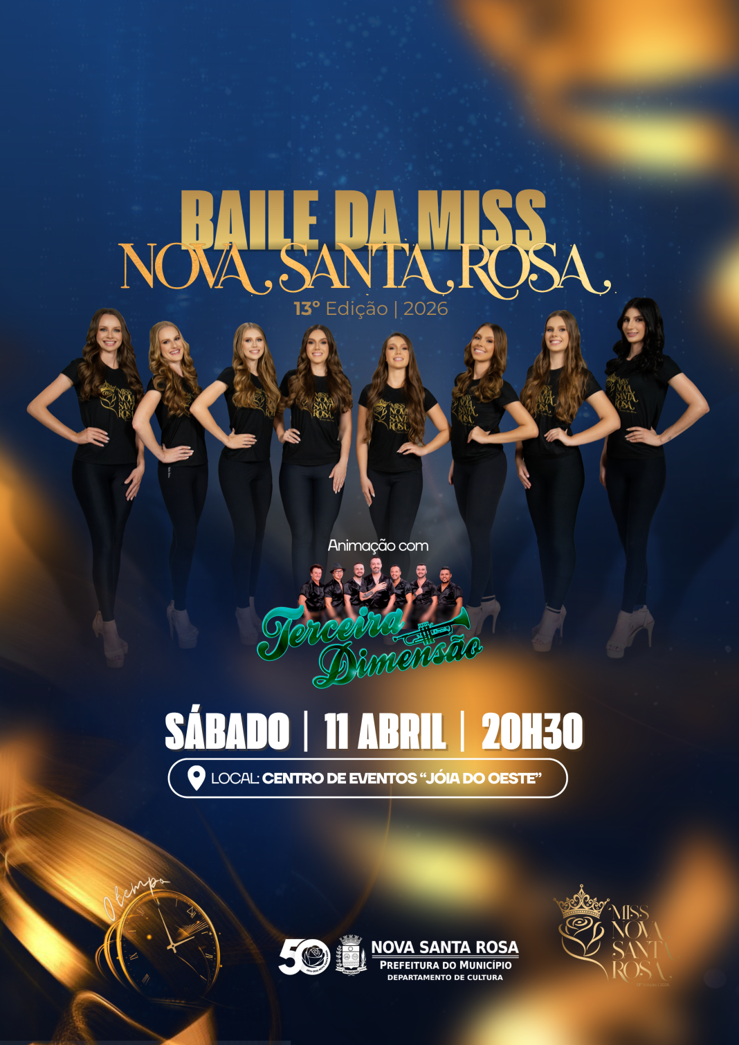 Além do desfile e da escolha da nova Miss Nova Santa Rosa, a noite contará com o tradicional baile, que terá como atração principal a banda Terceira Dimensão, conhecida por animar grandes eventos e garantir uma noite festiva para o público presente.