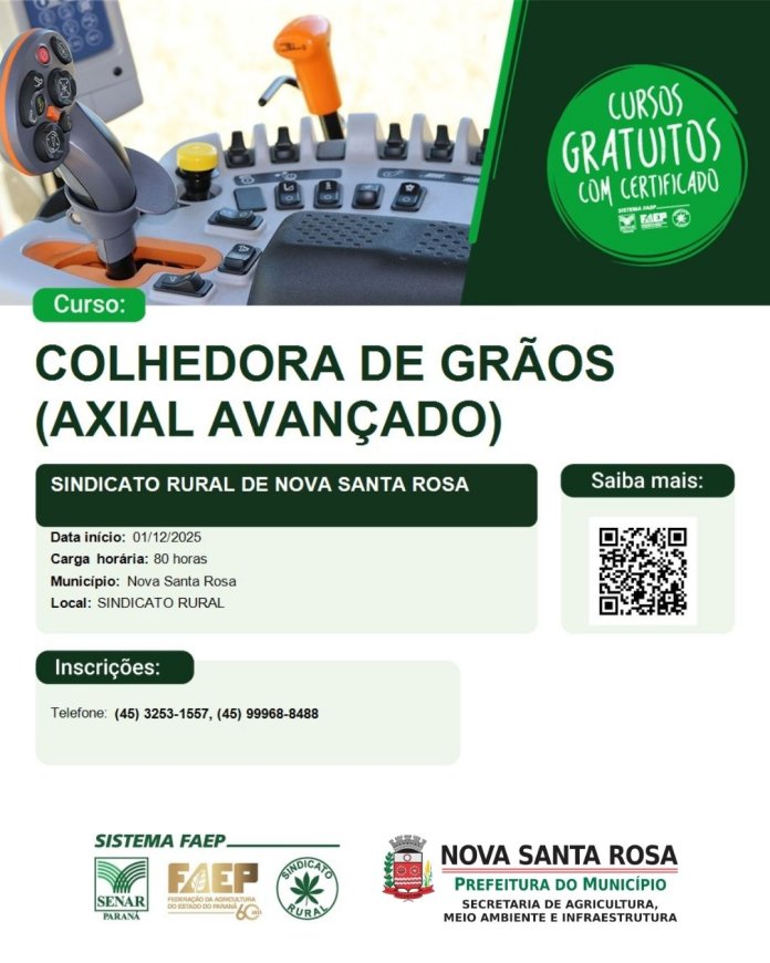 O Sindicato Rural de Nova Santa Rosa, em parceria com o SENAR-PR e com apoio da Secretaria de Agricultura, Meio Ambiente e Infraestrutura, está com inscrições abertas para o curso “Colhedora de Grãos – Axial Avançado”, totalmente gratuito e com certificado. O treinamento inicia no dia 1º de dezembro de 2025, tem carga horária de 80 horas e será realizado no Sindicato Rural.