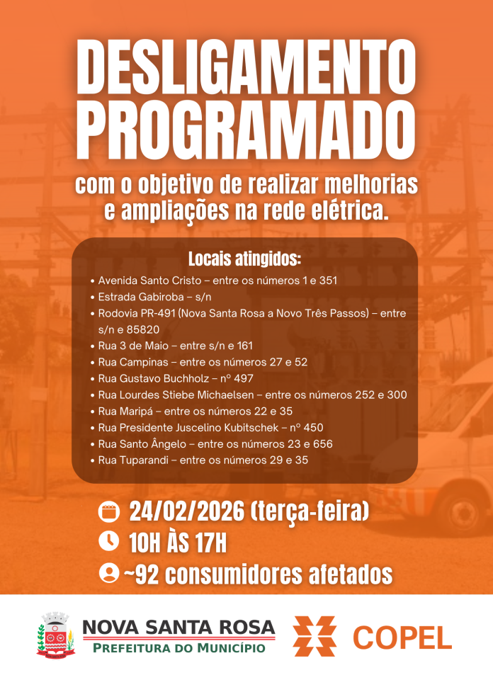 Moradores de Nova Santa Rosa devem ficar atentos a um desligamento programado no fornecimento de energia elétrica que ocorrerá nesta terça-feira, dia 24 de fevereiro, das 10h às 17h. A interrupção afetará 92 unidades consumidoras em diversos pontos do município.