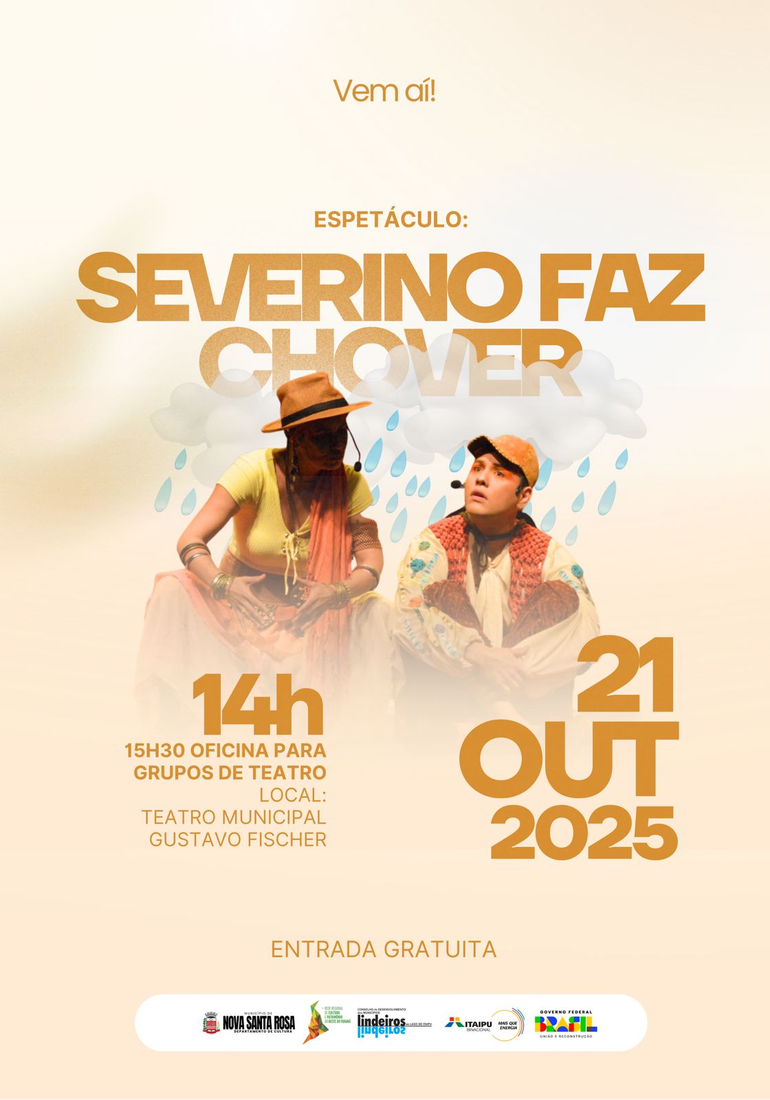 A peça é um espetáculo infantojuvenil que conta a história de um menino que mora no sertão nordestino, e que apesar de todas as dificuldades continua cheio de ideias e alegria. Com texto adaptado do livro de Ana Maria Machado, "Severino faz chover" busca levar até as crianças uma mensagem de amor e perseverança. E às 15h45, direcionado aos alunos do grupo de Teatro de Nova Santa Rosa, haverá uma oficina de jogos teatrais. Essa ação acontece através da Rede Regional de Cultura e Patrimônio do Oeste, com apoio do Convênio Linha Ecológica, Conselho dos Lindeiros e Itaipu Binacional.