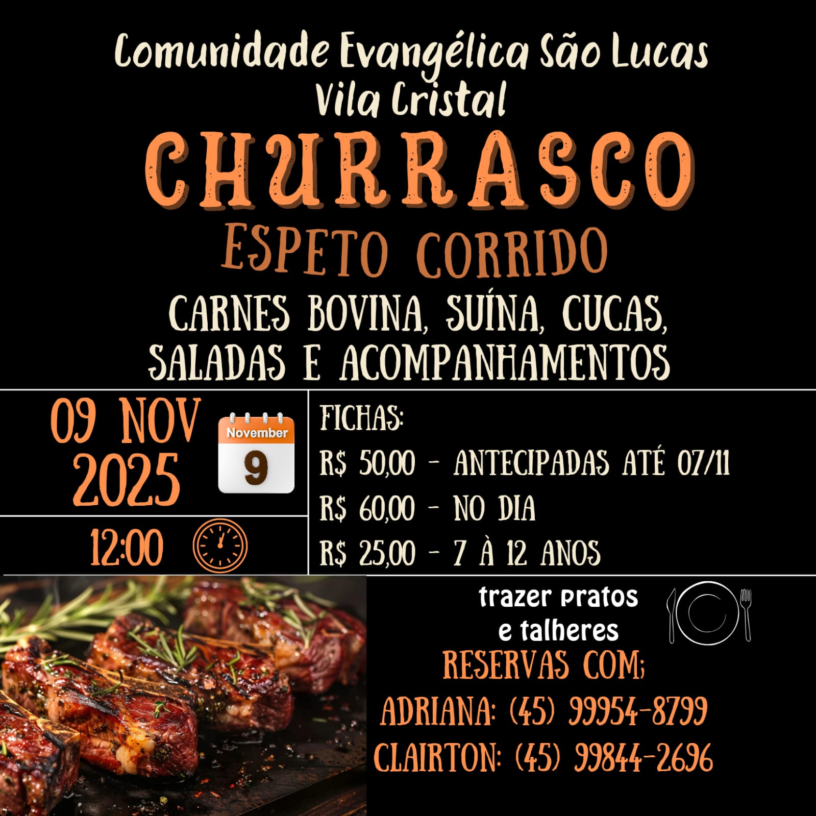 Festa da Colheita com almoço a base de Churrasco (espeto corrido) e acompanhamentos no Salão da Igreja Batista de Vila Cristal.