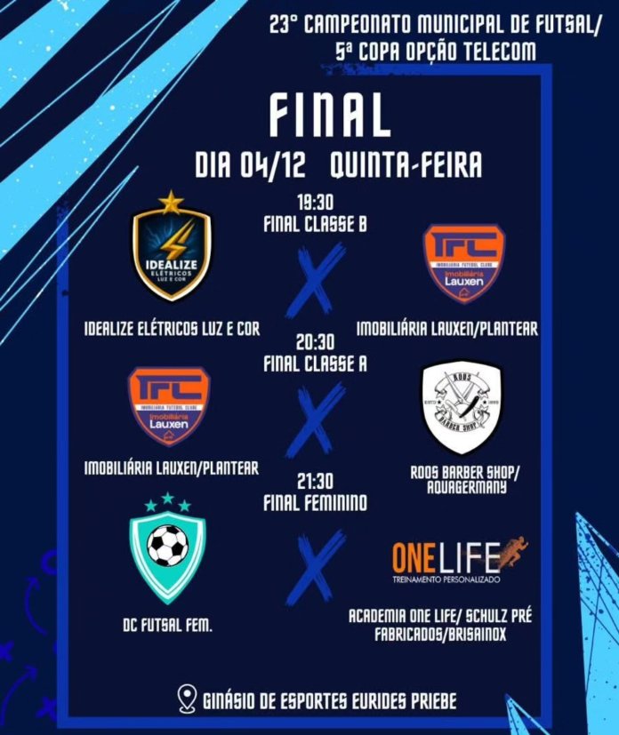 A noite desta quinta-feira (04) promete muita emoção no Ginásio de Esportes Eurides Priebe, com a disputa dos títulos do Campeonato Municipal de Futsal nas categorias Classe B, Classe A e Feminino.