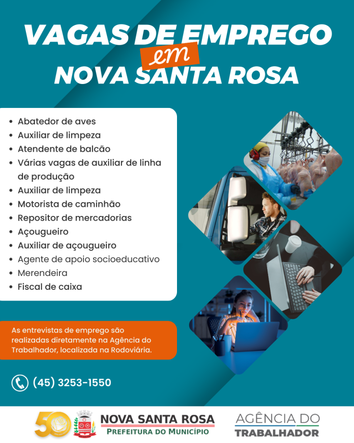 Moradores de Nova Santa Rosa que estão em busca de uma colocação no mercado de trabalho contam com novas oportunidades disponibilizadas por meio da Agência do Trabalhador. As vagas abrangem diferentes setores e perfis profissionais, desde funções operacionais até atendimento e transporte.