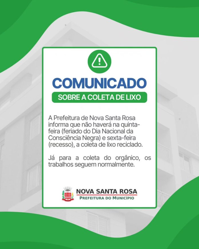 A Prefeitura de Nova Santa Rosa, por meio da Secretaria de Agricultura, Meio Ambiente e Infraestrutura, informa que não haverá coleta de lixo reciclado nesta quinta-feira (20), devido ao feriado do Dia Nacional da Consciência Negra, e na sexta-feira (21), em razão do recesso municipal.