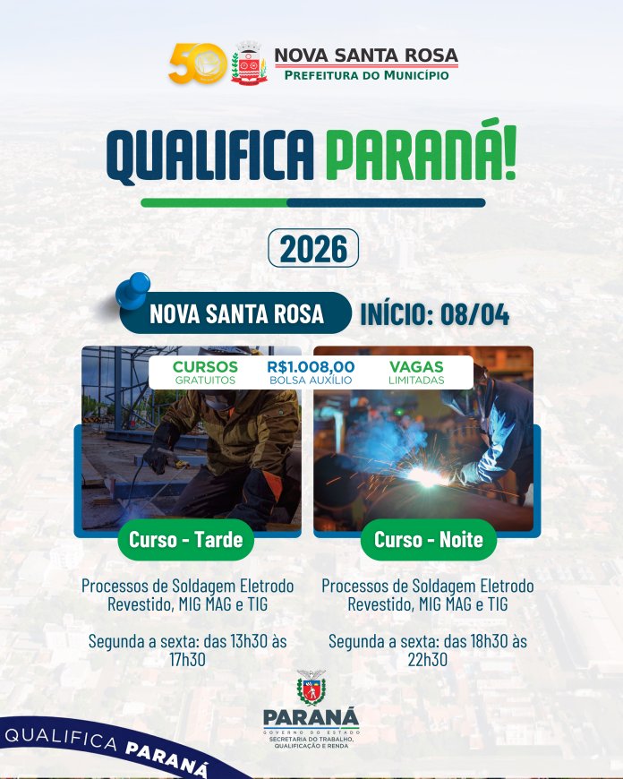 Estão abertas as inscrições para o curso gratuito de Processos de Soldagem Eletrodo Revestido, MIG/MAG e TIG, ofertado pelo programa Qualifica Paraná em Nova Santa Rosa. A iniciativa visa capacitar profissionais para atuação na indústria, com formação teórica e prática voltada à segurança e qualidade dos processos.