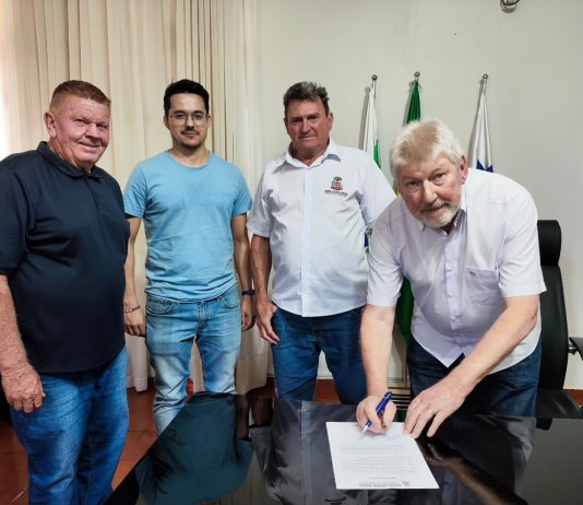 O prefeito de Nova Santa Rosa, Norberto Pinz, junto do vice prefeito, Noedi Max Hardt e do secretário de Agricultura, Meio Ambiente...