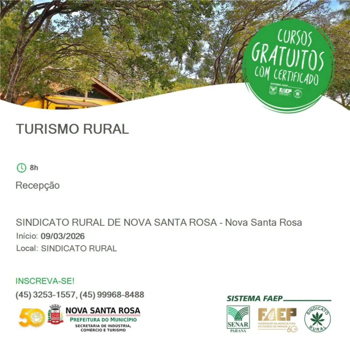 Com o apoio da Secretaria de Indústria, Comércio e Turismo de Nova Santa Rosa, o Serviço Nacional de Aprendizagem Rural – SENAR, por meio do Sindicato Rural de Nova Santa Rosa, segue com inscrições abertas para dois cursos gratuitos voltados ao fortalecimento do Turismo Rural no município.