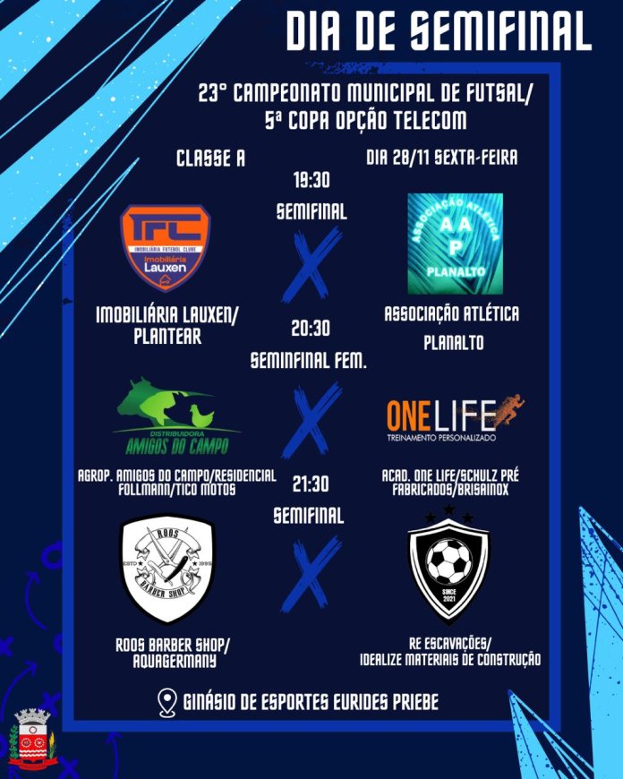 A programação inicia às 19h30, com a semifinal da Classe A entre Imobiliária Lauxen/Plantear e Associação Atlética Planalto. Na sequência, às 20h30, ocorre a semifinal do Feminino, colocando frente a frente Agropecuária Amigos do Campo/Residencial Follmann/Tico Motos e Academia One Life/Schulz Pré-Fabricados/Brisainox. Encerrando a noite, às 21h30, mais um duelo pela Classe A: Roos Barber Shop/Aquagermany enfrenta RE Escavações/Idealize Materiais de Construção.